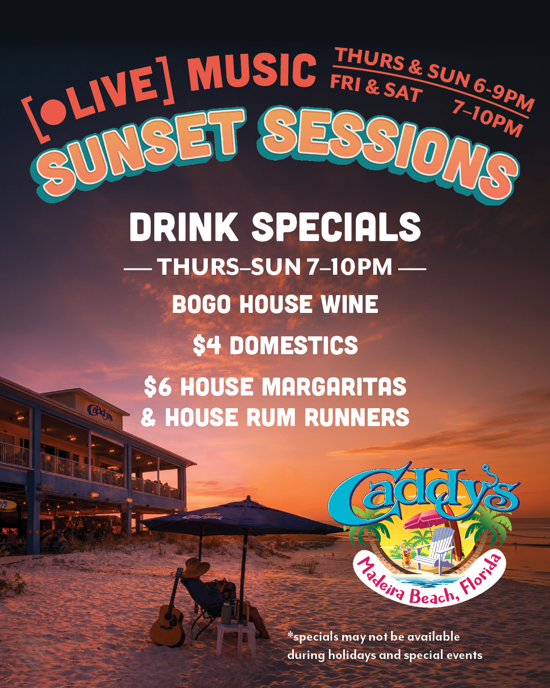 Enjoy waterfront dining at Caddy’s Madeira Beach.